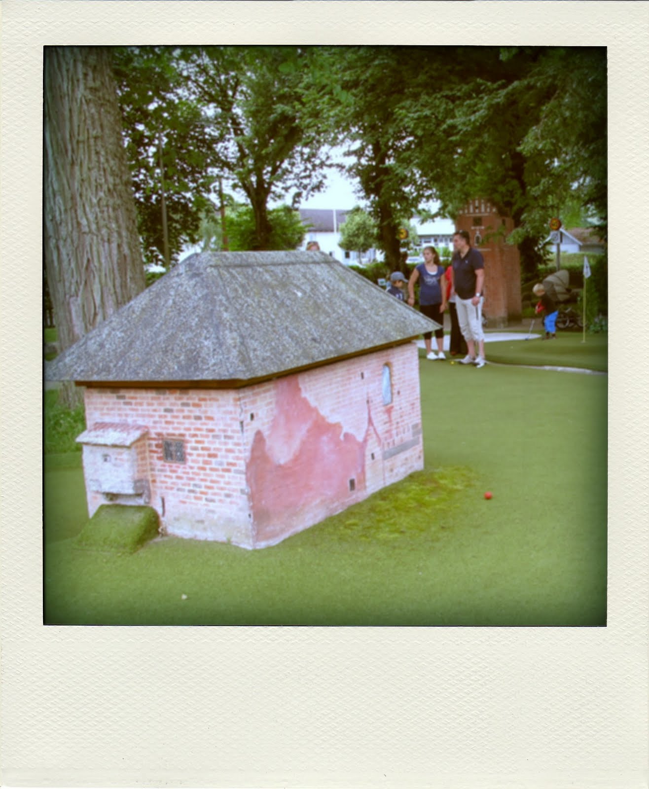 Att man på äventyrsgolfen (som bangolf utan kanter att studsa bollen mot) i Vadstena har modeller har stadens kända byggnader (här Mårten Skinnares hus, med Sveriges mest fotograferade toalett), men ingen modell av klosterkyrkan.