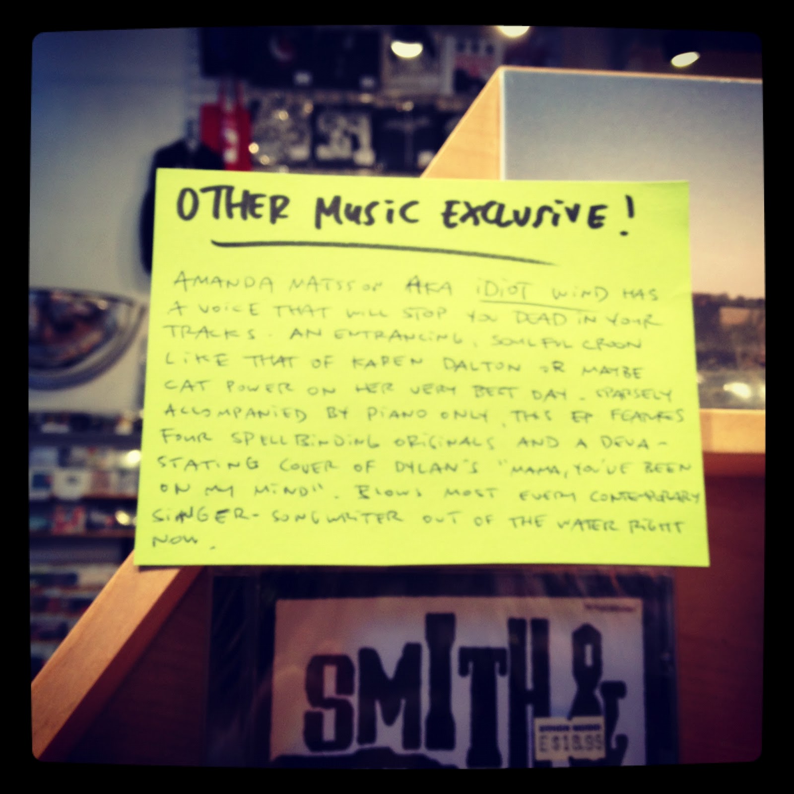 Och på Other Music (NoHo) en CD-EP med Idiot Wind. De enda skivbutikerna värda att stödköpa hos är ju de med handskrivna lappar och tipshyllor.