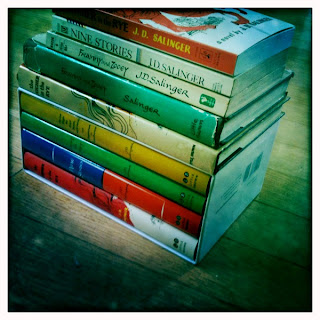 På bilden ser ni för övrigt mitt Salinger-facit för den här resan: nio stycken. Jag älskar den solblekta ryggen på en "Catcher in the Rye" som har gjort Michael Mitchells starka orange till en knappt märkbar aprikos.